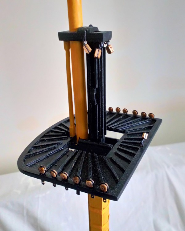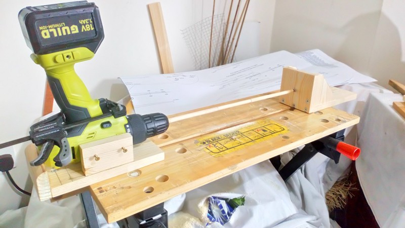 This is my lathe completed and working. My drill doesn't have a lock on the proportion speed trigger so I use a small adjustable clamp. At the moment I use a bastard file to reduce and taper the main yard . It's working fine on this 8mm dia, let's hope it'll be good fore the thinner ones.