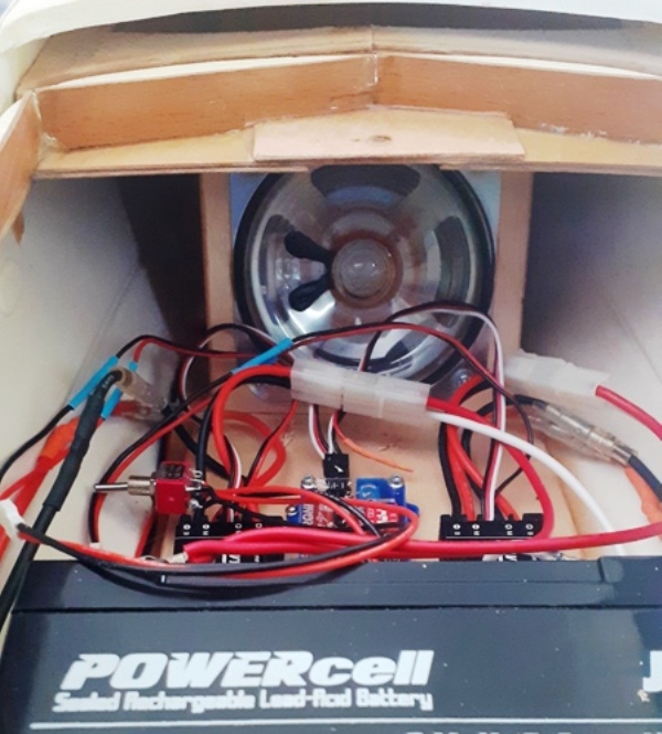 The aluminium box behind the motors is the new housing for sound card I installed last year, with the addition of a 10w amplifier at 12v. As I'm only using a 6v supply it gives 5w, more than enough. The box also doubles up as a heat sink for the amplifier, probably not needed, but better safe than sorry. The reason I'm only using 6v is that this is the second battery I use as ballast in the stern. The speaker is mounted under the fore deck, is water proof and 100mm in diameter.