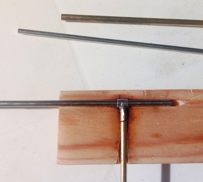 Cut 15mm length of 1/8 brass rod and 5mm of brass tube. Solder at right angles. File the solder smooth. Repeat 20 times.