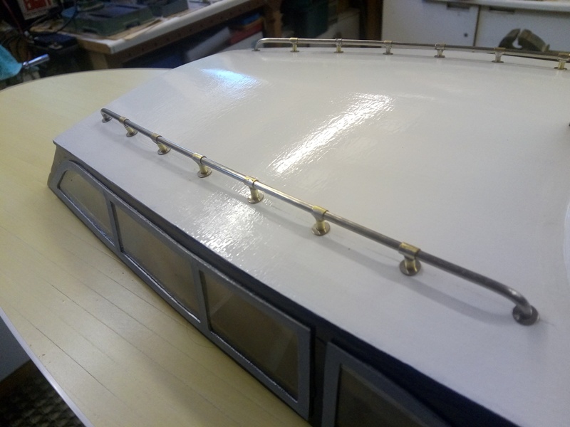 Bend the ends of the 1/8 stainless rod for the rails (after remembering to slide on the supports!). Bend to match the roof.