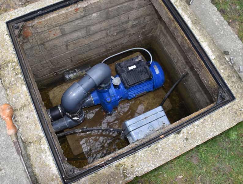 The pond pump 'currently unplugged' due to water in the compartment. Not our project