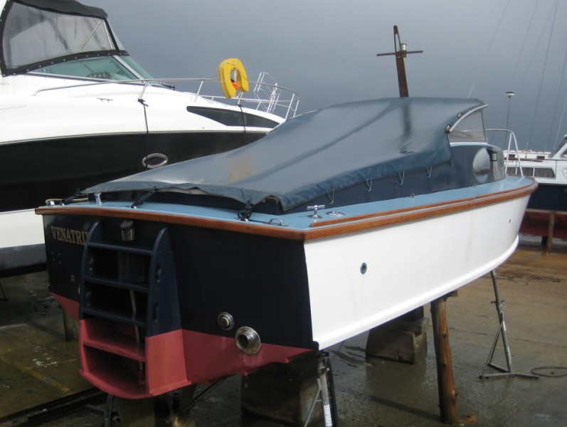 The rudder on a Fairey Huntress is attached to the outside of the transom. The rudder shaft can be seen in the picture below. The tiller faces forward through the transom under a cover between the two uppermost steps.