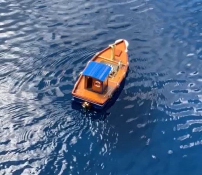 Double sized Sea Commander and rowing boat dwarf the Americas Cup yacht.