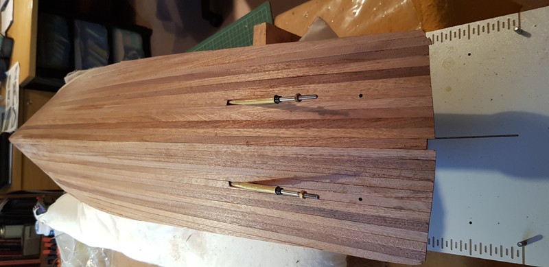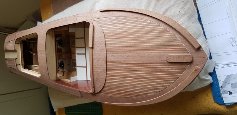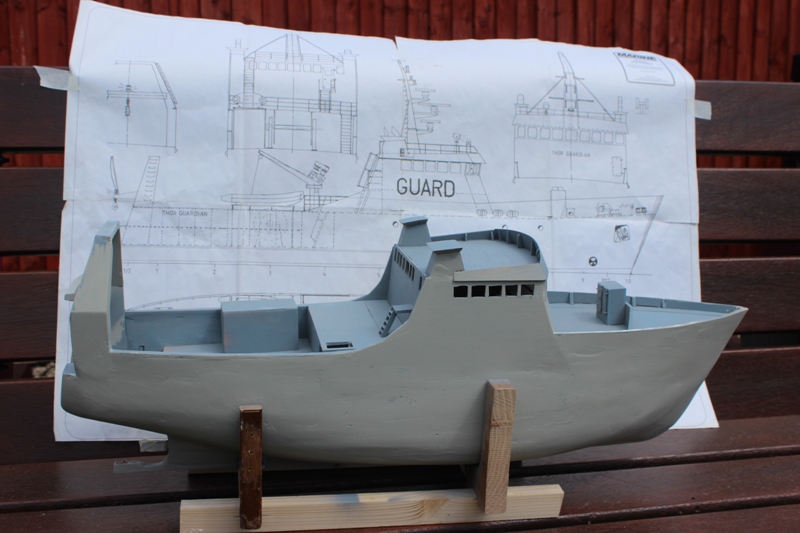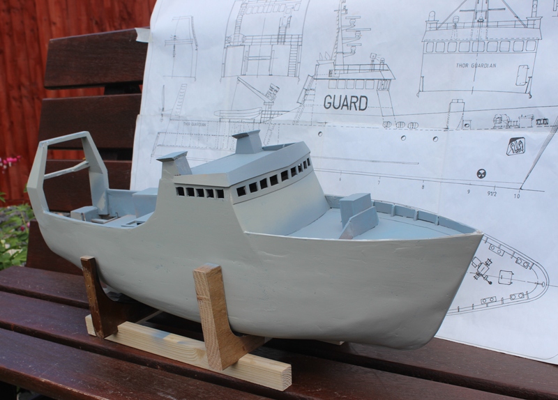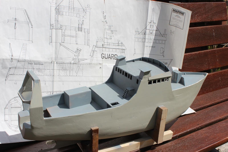With all this time on my hands I thought instead of gardening and decorating I would like to do something different. I was looking at some old Marine Modelling Magazine and I came across plans of a Shelter Deck Trawler called a Thor Guardian. With Roger Tansley's help with some thin ply, motor, plus speed controllers and the loan of a small bench circular saw you can see the results so far in the photos.