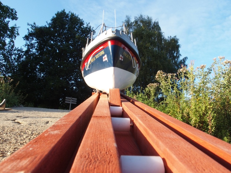 For the last couple of weeks work on the new boat has paused whilst I have been working on a little side project. A couple of years back I built a Solent Class Lifeboat, which is designed to be launched down a Slipway. I always wanted to launch my boat down a Slipway, so I have built myself a proper Roller Slipway! The design is pretty simple, just a plywood base with a pair of battens 30mm apart in the centre, just wide enough for the keel and a bit extra to allow for clearance. I made some Nylon Rollers (On my new Proxxon Lathe!) and these are mounted on a short length of Brass 4mm Bar, which fit into holes drilled into the battens. There are a further 2 battens, one each side, to support the Bilge Keels. Total length of the Slipway is 2.4m, and the whole contraption is made of 2 pieces which slot together, for easier storage and transport. The raised end is supported by folding legs, and the lower end rests on the ground. There is a 'Stopper' device mounted in the centre of the keel, which is sprung loaded to return to the 'Stop' position. This prevents the boat from going down the slipway, until required. This is attached to a cord which when pulled, moves the Stopper so that it lays flat, thus releasing the boat to roll down the Slipway. When the boat is pulled back up the Slipway, the Stopper just pivots down, so as not to impede the recovery. I have attached a few photos that i took yesterday, when i tried this out for the first time at Dunorlan Park.